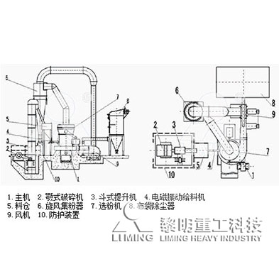 高壓懸輥磨整套設備由主機、減速機、分析機、管道裝置、鼓風機、除塵器、顎式破碎機、斗式提升機、電磁振動給料機、電控系統等組成。