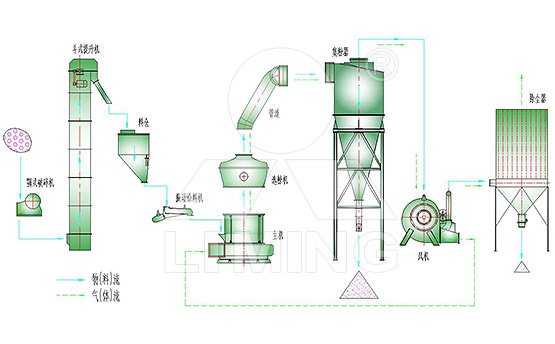儲存在原料庫中的物料,經破碎機破碎后通過提升機提至調節料倉,再經電磁振動給料機送入歐版磨主機內進行粉磨,在此環節除鐵器將含鐵異物排除,確保主機內部正常運作。物料在磨粉機內部通過磨輥和磨環的相互碾壓、研磨而被粉碎,粉碎后的物料在風力的作用下吹向選粉機進行分選,分選后的合格物料經管道進入旋風集粉器收集,經卸料閥輸出即為成品,未達到細度要求的物料重新回到主機再次研磨,粉磨后的成品通過提升機提至成品料罐儲存。