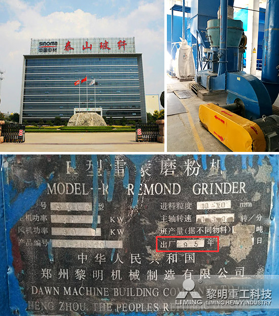 今年的走訪活動中,更令人稱道的是:中國中材泰山玻璃纖維有限公司,一臺由黎明重工于1995年生產(chǎn),迄今投產(chǎn)21年之久的磨粉機仍在為客戶效力,并保持正常運行。進入整潔規(guī)范的客戶生產(chǎn)現(xiàn)場,這臺藍色的雷蒙磨粉機正在有條不紊地作業(yè)進行中。與目前以灰白為主色調(diào)的新一代磨機外殼體大氣的外觀不同,雷蒙磨的藍色機身顯得清新活力。但是機身上面斑駁的銘牌依然告訴我們,這已經(jīng)是一員“老將”了。銘牌雖然斑駁,但上面各項功率、型號及生產(chǎn)日期還清晰可見。通過上面的文字,我們了解到這臺R型雷蒙磨粉機生產(chǎn)于1995年,型號是雷蒙磨粉機3216型。在與客戶聊天中,走訪人員了解到這臺磨機加工的物料是葉臘石,盡管已經(jīng)使用二十余年,仍然正常運行沒有出現(xiàn)重大問題。