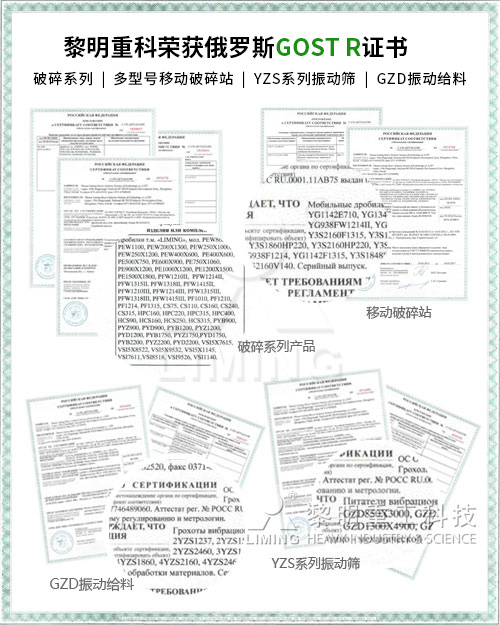 近日,黎明重工科技破碎磨粉系列的百余種型號產(chǎn)品通過了俄羅斯質(zhì)量認(rèn)證—GOST認(rèn)證,成為繼CE認(rèn)證后的第二個(gè)國際質(zhì)量認(rèn)證。