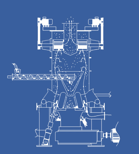 主電機通過減速機帶動磨盤轉動,同時風從進風口進入LUM超細立式磨機,物料經螺旋給料機下料口落在磨盤,在離心力的作用下,物料從磨盤向邊緣均勻移動,經過磨盤上的粉磨輥道區域時,受到磨輥的碾壓,大塊物料直接被壓碎,細粒物料受擠壓后形成料床進行粒間粉碎。被粉碎的物料繼續向磨盤邊緣移動,直到被風環處的強氣流帶走,而較大的顆粒物料又重新掉落到磨盤上繼續粉碎,氣流中的物料經過上部的分離器時,在轉子葉片的作用下,粗顆粒重新回到磨盤上粉磨,合格的細粉隨氣流一起出磨,被系統的集粉器收集,被收集到的粉料即為超細立磨磨出的產品?;烊胛锪系蔫F塊等雜物隨物料運動到磨盤邊緣時,由于自身重量大而不能被風吹起,跌落至磨機下腔被安裝在磨盤底部的刮料板刮入排渣口排出機外。