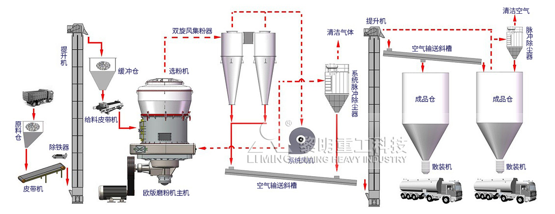黎明重工的歐版磨粉機粉磨系統采用干式磨粉,在爐外煙氣脫硫制粉應用許多,目前在原有基礎上將歐版磨粉機的系統優化、風機調整、選粉機優化,并增加二次分級設備,完全能滿足爐內和爐外同時供粉的需求,同時生產1mm-0.045mm(爐內脫硫用)和0-0.045(爐外脫硫用)兩種不同粒徑的石灰石脫硫劑粉。爐內爐外脫硫劑粉磨系統僅增加一臺分級機和部分輸送設備,相對于傳統需要上兩套系統生產兩種產品,可以大大的節省設備投資和生產用地,在不增加工作人員的基礎上節省一套制備系統的人員費用開支。